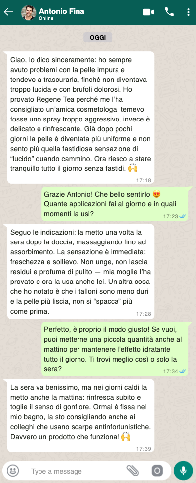 Regene Tea è un trattamento cosmetico delicato e non invasivo: agisce in modo rapido, rinfrescante e adatto a tutti i tipi di pelle, anche le più sensibili. Non promette miracoli, ma aiuta davvero a ritrovare una pelle più pulita, fresca e uniforme, specialmente nelle giornate calde o dopo l’attività sportiva. Come per ogni prodotto naturale, i risultati possono variare da persona a persona: consiglio di vaporizzarlo su pelle pulita, lasciando asciugare senza risciacquare.